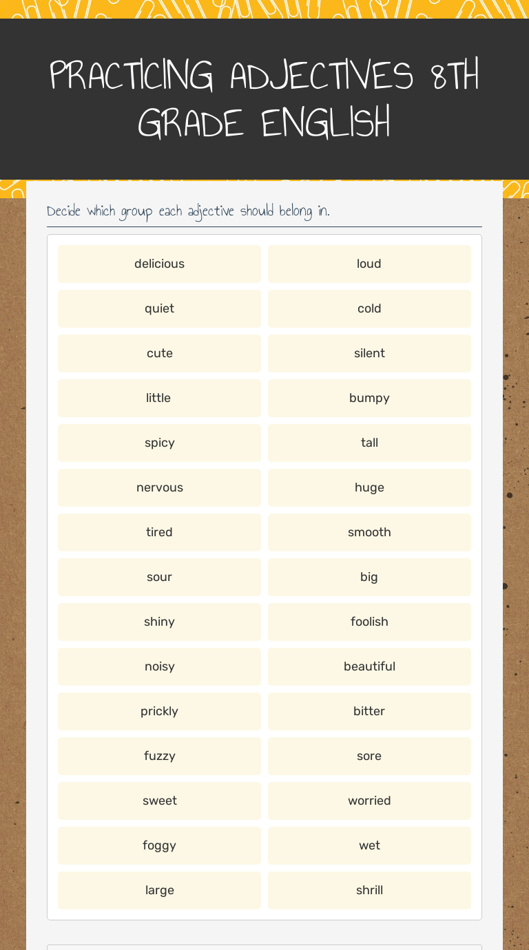 Eighth Grade Adjective Worksheet - Adjectives Quiz For Grade 7 Proprofs Quiz :. • may have minor errors. Adjectives are words that describe nouns. Spelling words for 7th grade worksheets spelling words for 7th grade worksheets. Step up your practice with our printable 8th grade language arts worksheets that are accompanied by answer keys and feature adequate exercises in forming . Here is a graphic preview for all the 6th grade, 7th grade and 8th grade regular adjectives worksheets .